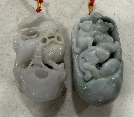 Two Carved Jade Foo Dog and Horse Pendants, 3", Location Front Left Shelves Two Carved Jade Foo Dog and Horse Pendants, 3", Location Front Left Shelves