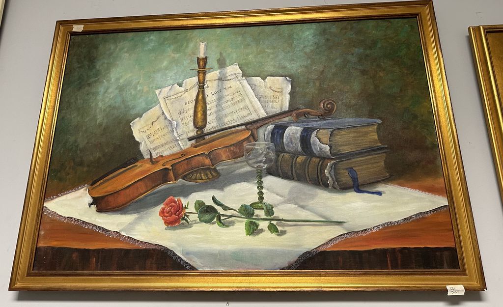 Betty Hamilton Still Life Music Painting, on canvas, gold gilt, 27"h., 39"w. Mississippi Artist, Location Right Office 2 Betty Hamilton Still Life Music Painting, on canvas, gold gilt, 27"h., 39"w. Mississippi Artist, Location Right Office 2