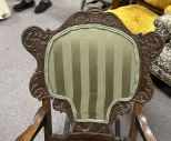 Antique Carved Oak Parlor Rocker, carved back, striped fabric cushions, good condition. Location Row 0 Antique Carved Oak Parlor Rocker, carved back, striped fabric cushions, good condition. Location Row 0