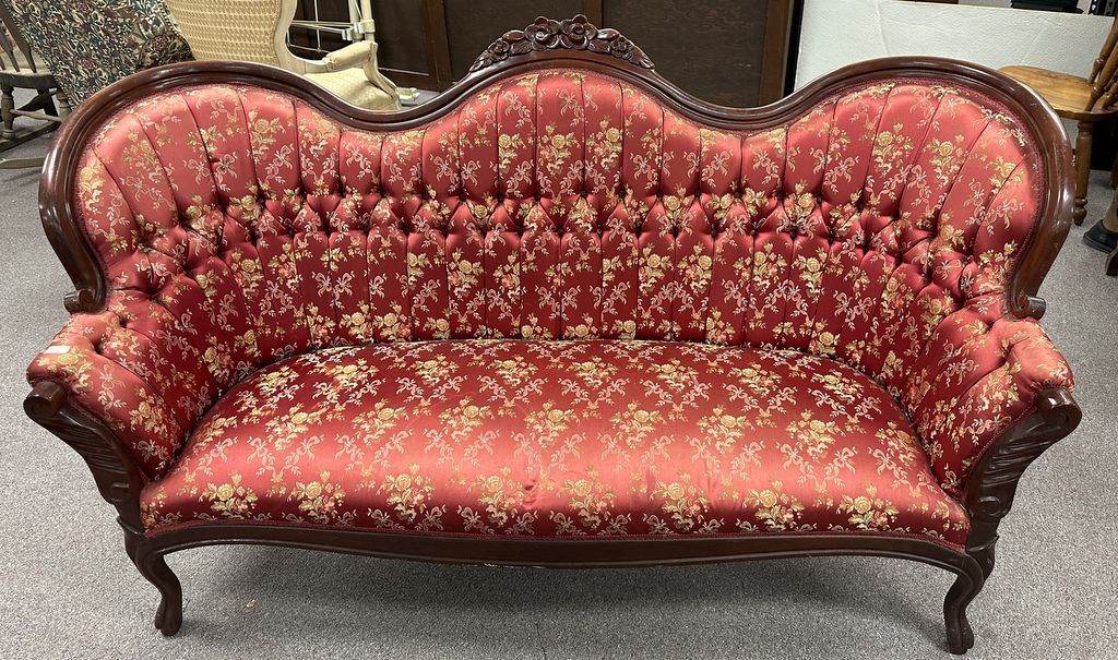 Vintage Victorian Mahogany Sofa, red floral upholstered, button tufted, 68"w. Location Row 0 Vintage Victorian Mahogany Sofa, red floral upholstered, button tufted, 68"w. Location Row 0