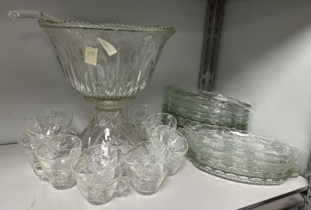 Mid Century Grapevine Clear Glass Punch Set, bowl, cups, luncheon plates, Location Right Metal Shelves 29 Mid Century Grapevine Clear Glass Punch Set, bowl, cups, luncheon plates, Location Right Metal Shelves 29