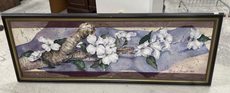 Large Becky L. Barnett 1964-2023-1994 Water Color of Flowers, Clinton, MS Artist, Art Teacher, framed, 24"h., 64"w. Large Becky L. Barnett 1964-2023-1994 Water Color of Flowers, Clinton, MS Artist, Art Teacher, framed, 24"h., 64"w.