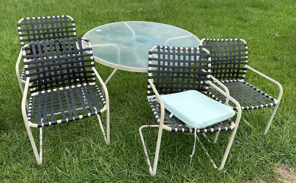 Vintage White Iron Patio table and Chair Set, green banded arm chairs, some wear. Vintage White Iron Patio table and Chair Set, green banded arm chairs, some wear.