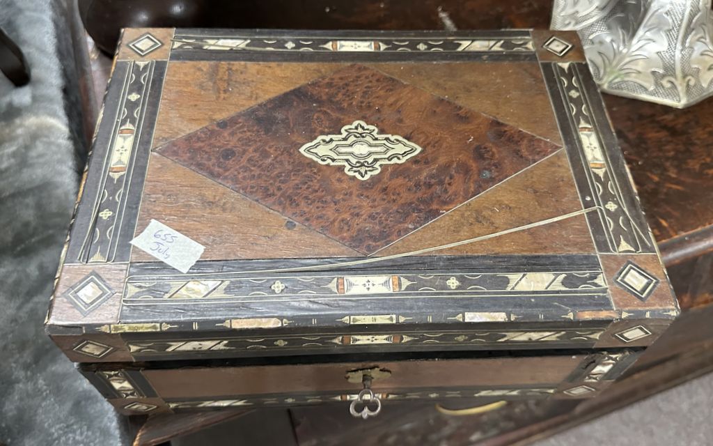 Antique Lap Desk, worn, needs work, mother of pearl, 13"w. Location Row 3 Antique Lap Desk, worn, needs work, mother of pearl, 13"w. Location Row 3