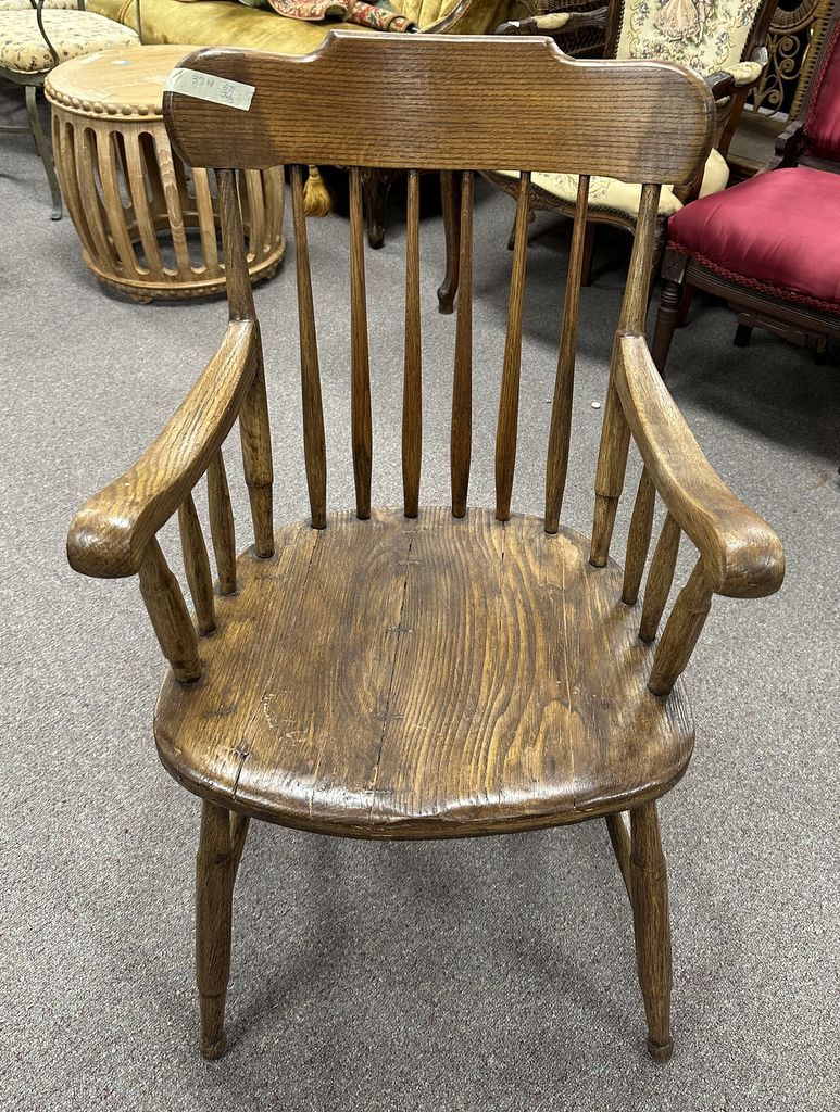 Vintage Worn Oak Spindle Arm Chair, age wear Location Row 1 Vintage Worn Oak Spindle Arm Chair, age wear Location Row 1