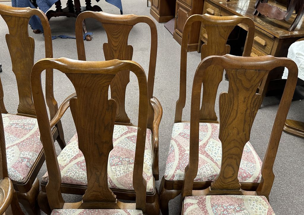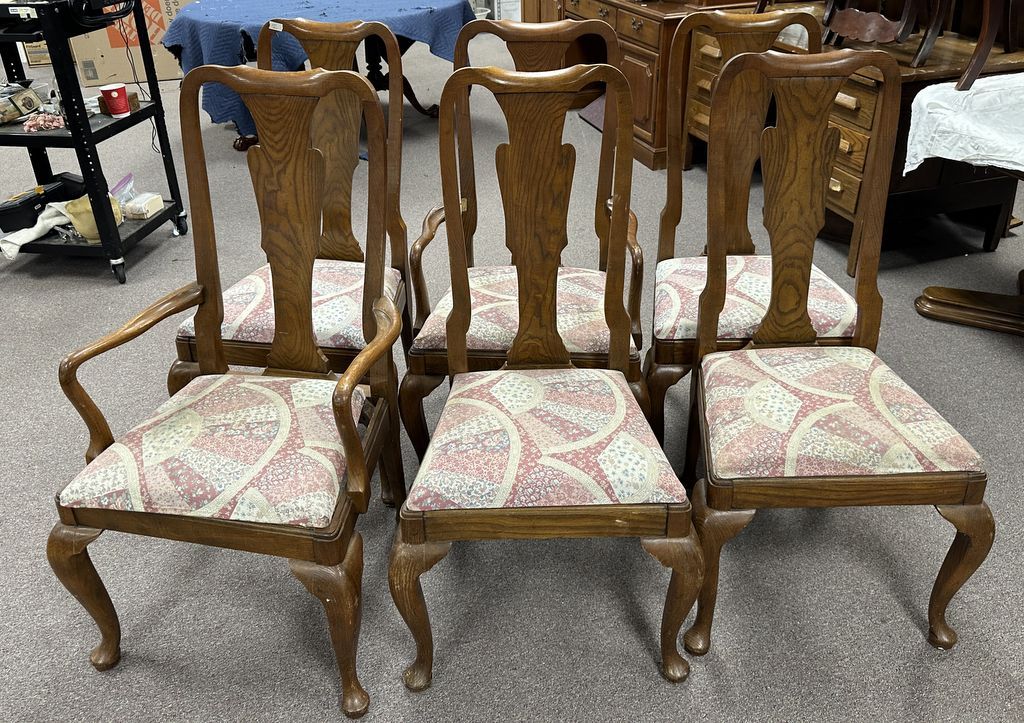 6 Mid Century Queen Anne Oak Dining Chairs, some damage arms, needs work 6 Mid Century Queen Anne Oak Dining Chairs, some damage arms, needs work