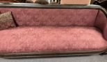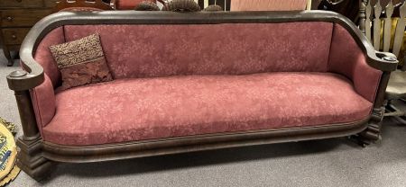 Antique Empire Mahogany Sofa, red upholstered, scroll arm, age wear, 90"w. Location Row 0 Antique Empire Mahogany Sofa, red upholstered, scroll arm, age wear, 90"w. Location Row 0