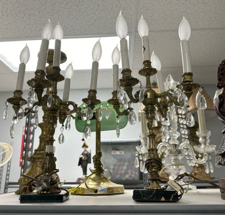 Pair of Brass Five Arm Candelabra Lamps, Location Back Metal Shelves 22 Pair of Brass Five Arm Candelabra Lamps, Location Back Metal Shelves 22