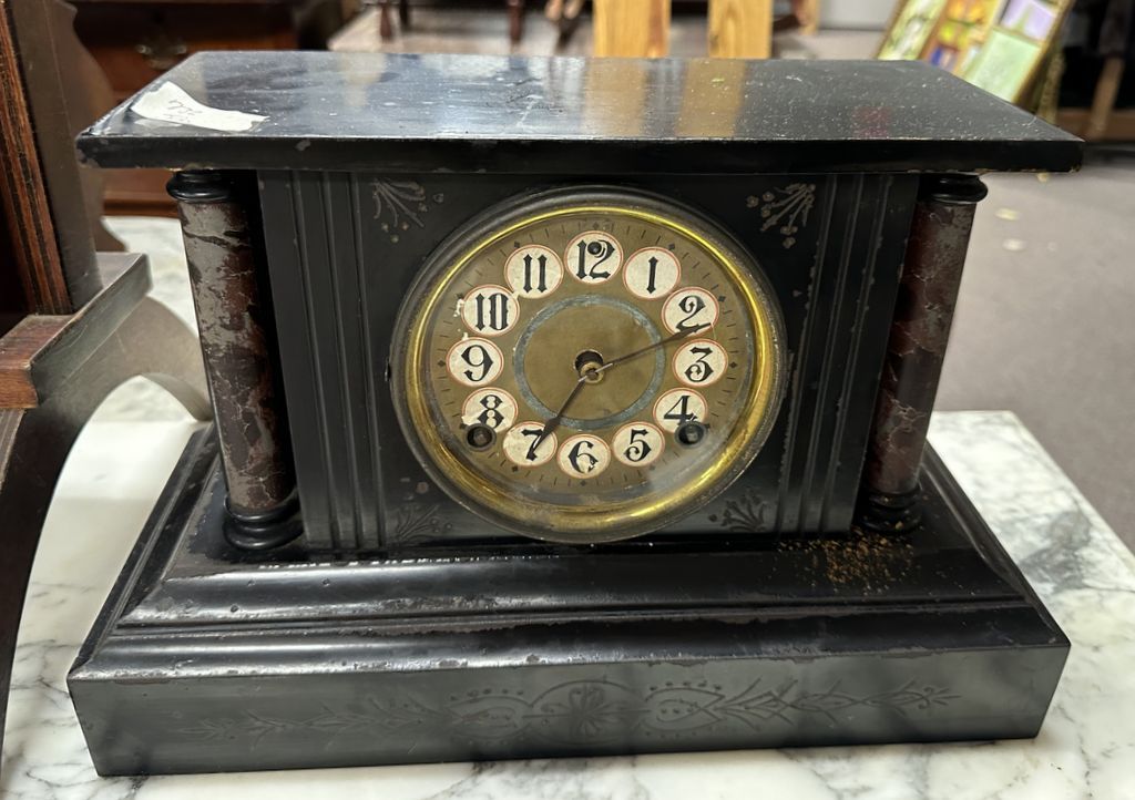 Victorian Marble Style Black Mantle Clock, needs work, 10"h., 14"w. Location Row 3 Victorian Marble Style Black Mantle Clock, needs work, 10"h., 14"w. Location Row 3