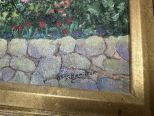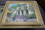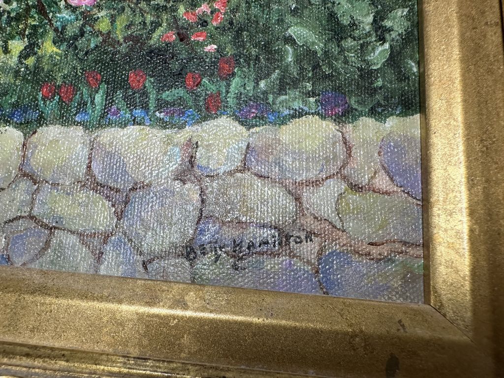 Betty Hamilton Signed Flowers on House Painting, Mississippi Artist, on canvas, framed, 19"h., 24"w, Location Right Wood rack Betty Hamilton Signed Flowers on House Painting, Mississippi Artist, on canvas, framed, 19"h., 24"w, Location Right Wood rack