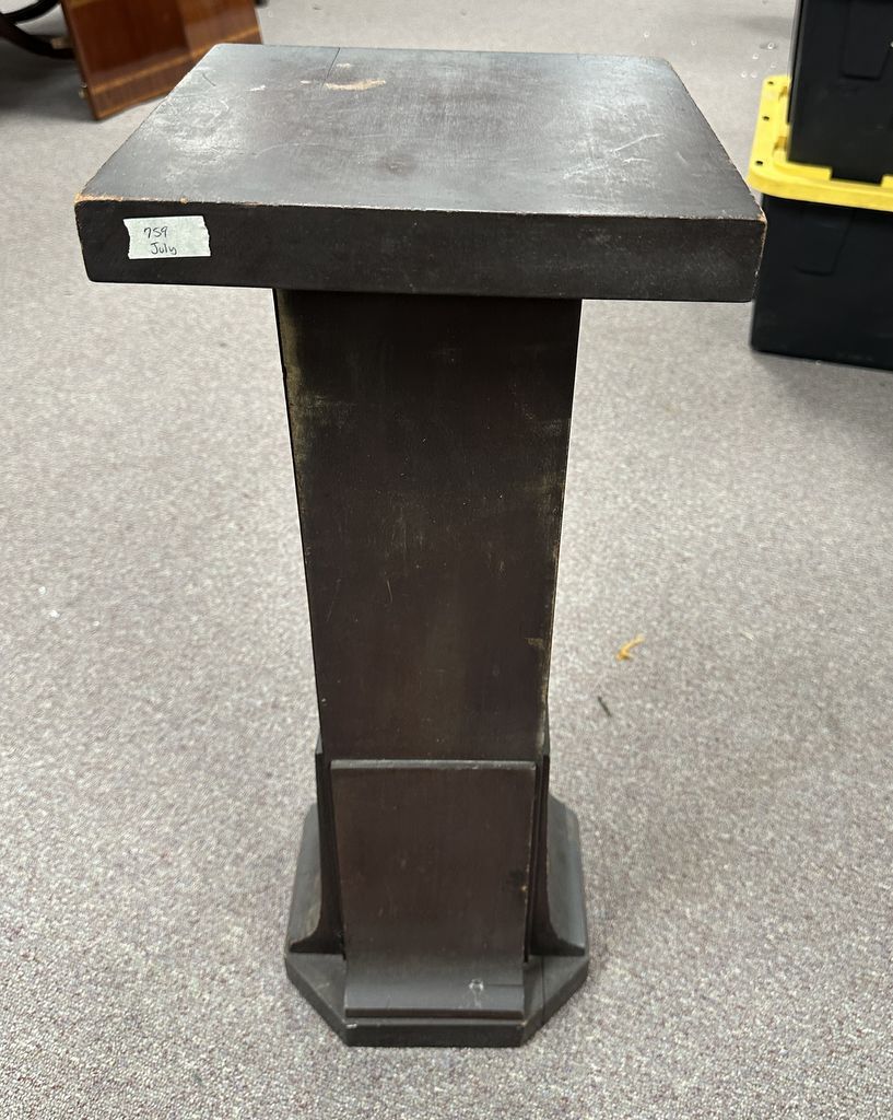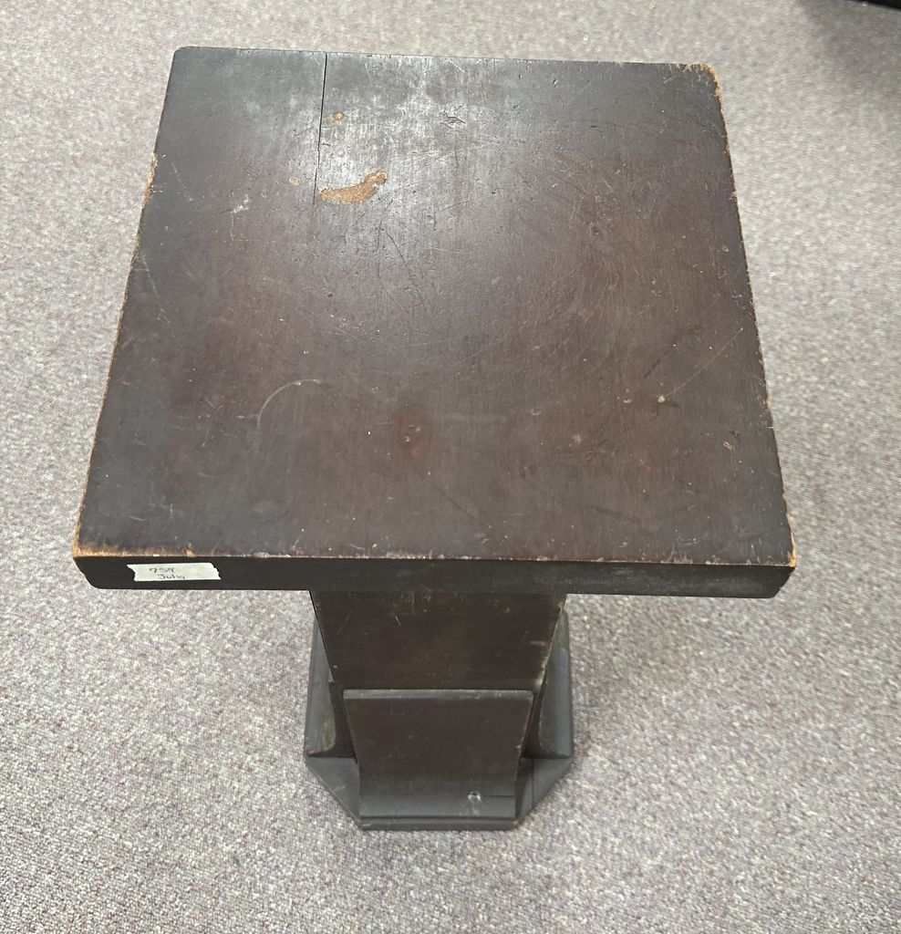 Vintage Mahogany Square Pedestal Table, worn finish, 30"h., 12"w. Location Row 4 Vintage Mahogany Square Pedestal Table, worn finish, 30"h., 12"w. Location Row 4