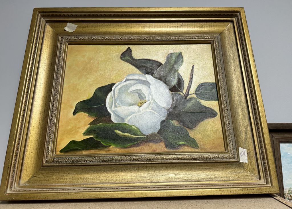 Betty Hamilton Still Life Magnolia Painting, Mississippi Artist, on canvas, framed, 20"h., 23"w, Location Right Office 3 Betty Hamilton Still Life Magnolia Painting, Mississippi Artist, on canvas, framed, 20"h., 23"w, Location Right Office 3