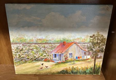 Betty Hamilton Folk Art Farm Painting, Mississippi Artist, on canvas, unframed, 18" x 20", Location Right Office 3 Betty Hamilton Folk Art Farm Painting, Mississippi Artist, on canvas, unframed, 18" x 20", Location Right Office 3