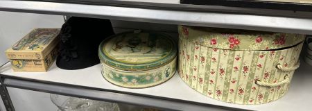 Scala Pronto Cloche Felt Hat, Hat Box, Southern Biscuit Tin and Mother Goose Shoe Box, Location Right Metal Shelves 28 Scala Pronto Cloche Felt Hat, Hat Box, Southern Biscuit Tin and Mother Goose Shoe Box, Location Right Metal Shelves 28