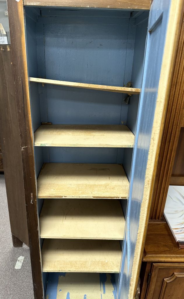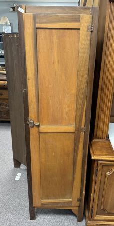 Vintage Narrow Wood Storage Cabinet, shelves 68"h., 19"w. Location Row 4 Vintage Narrow Wood Storage Cabinet, shelves 68"h., 19"w. Location Row 4