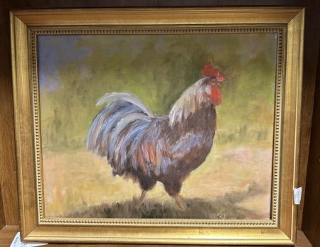 Betty Hamilton Painting of Rooster, Mississippi Artist, gold gilt framed, on canvas, 20"h., 23"w. Location Right Office 3 Betty Hamilton Painting of Rooster, Mississippi Artist, gold gilt framed, on canvas, 20"h., 23"w. Location Right Office 3