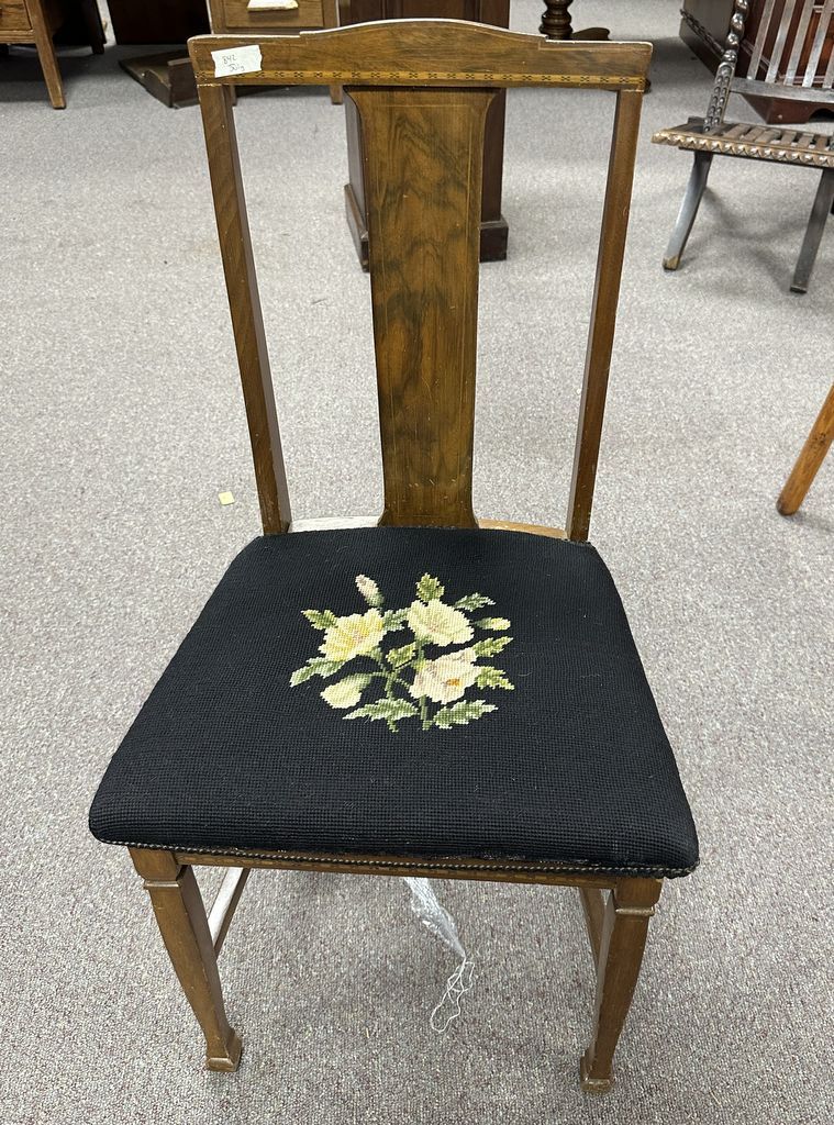 Antique Mahogany Traditional T Back Side Chair, needlepoint cushion. Location Row 3 Antique Mahogany Traditional T Back Side Chair, needlepoint cushion. Location Row 3