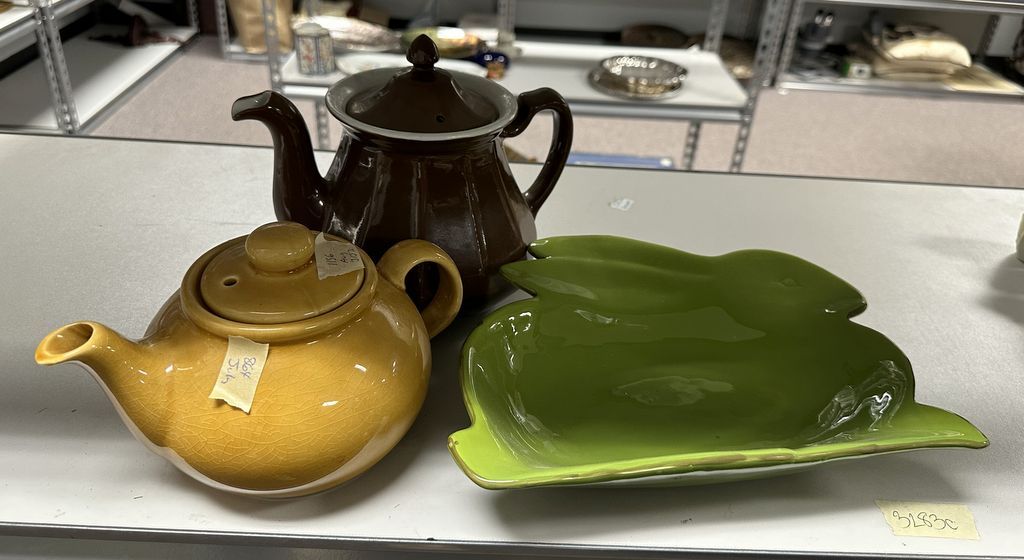 Ceramic Glazed Teapots and Rabbit Dish, Location Back Metal Shelves Ceramic Glazed Teapots and Rabbit Dish, Location Back Metal Shelves