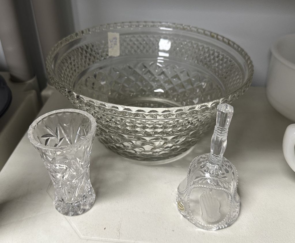 Vintage Pressed Glass Bowl, Vase, and Bell, Location Left Office-2 Vintage Pressed Glass Bowl, Vase, and Bell, Location Left Office-2