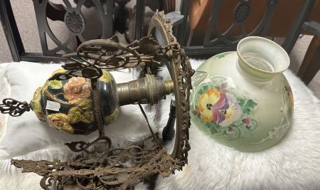 Antique Porcelain Oil Lamp Light Fixture, with glass shade, electrified. Location Left office Antique Porcelain Oil Lamp Light Fixture, with glass shade, electrified. Location Left office
