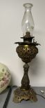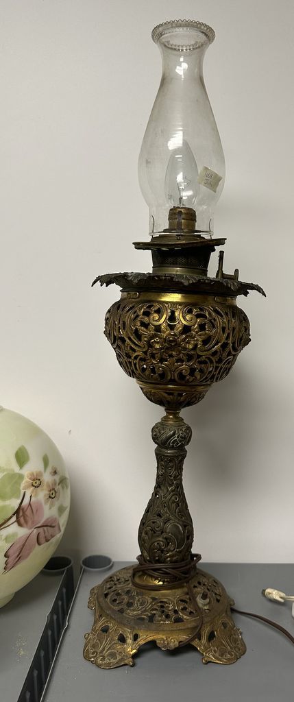 Pierced Gilt Brass Cloisonne Banquet Lamp, glass chimney, Location Left Office-9 Pierced Gilt Brass Cloisonne Banquet Lamp, glass chimney, Location Left Office-9
