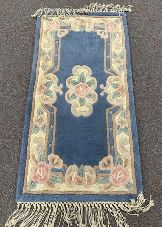 1'10 x 3'6 Chinese Wool Rug, blue and white. Location Row 4 1'10 x 3'6 Chinese Wool Rug, blue and white. Location Row 4