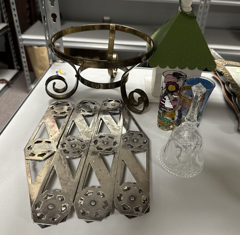 Group of Decorative Items, silver plate trivet, vase stand, birdhouse, bell, Location Back Metal Shelves 22 Group of Decorative Items, silver plate trivet, vase stand, birdhouse, bell, Location Back Metal Shelves 22