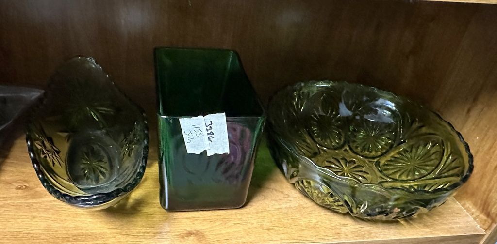 Green Emerald Napco Vase, Green Anchor Hocking Bowl and Banana Dish, Location Right Office 3 Green Emerald Napco Vase, Green Anchor Hocking Bowl and Banana Dish, Location Right Office 3