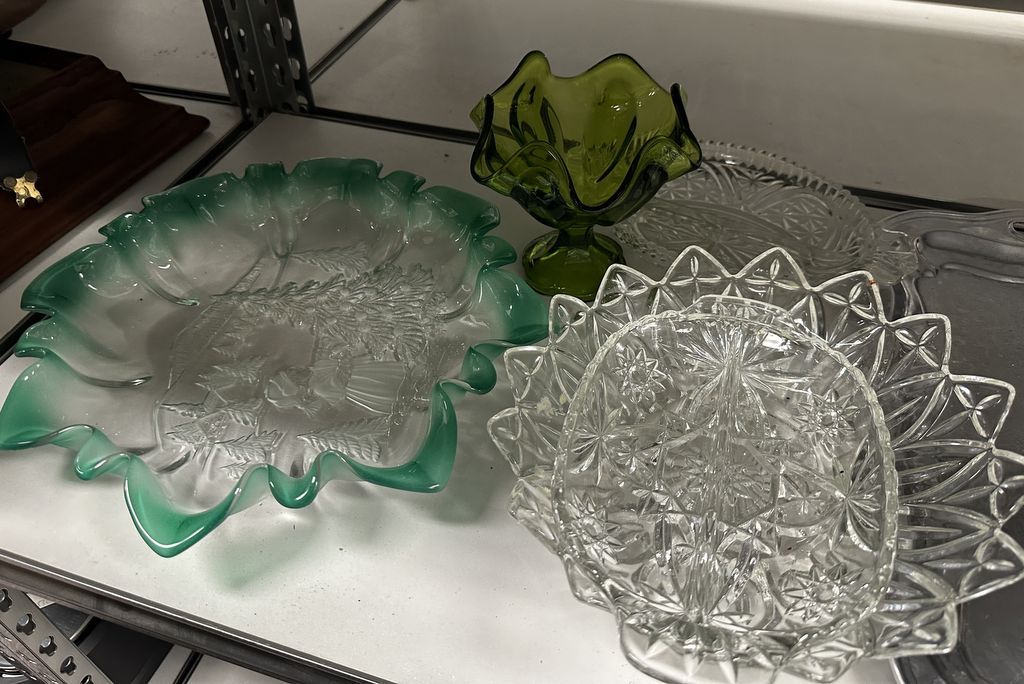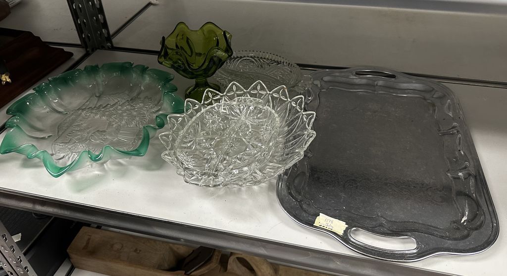 Glass Serving Bowl and Silver Plate Platter, Location Right Metal Shelves 39 Glass Serving Bowl and Silver Plate Platter, Location Right Metal Shelves 39