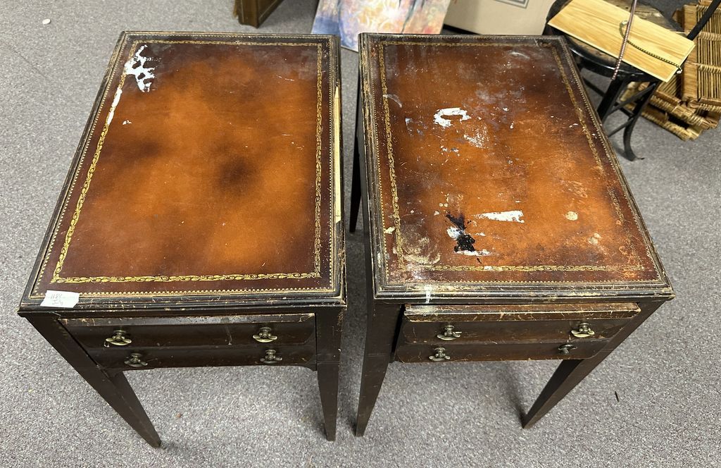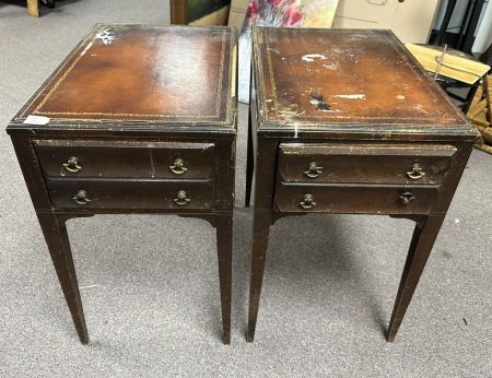 Pair of Worn Duncan Phyfe Side Tables, worn leather tops, 25"h., 15"w. Location Row 5 Pair of Worn Duncan Phyfe Side Tables, worn leather tops, 25"h., 15"w. Location Row 5
