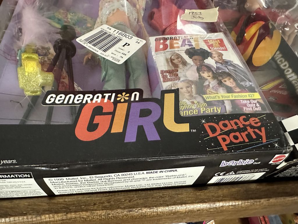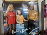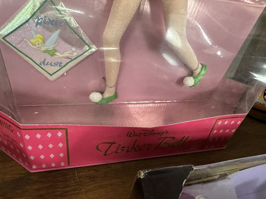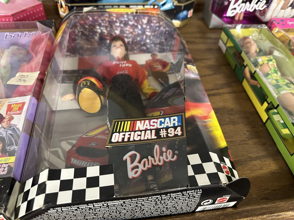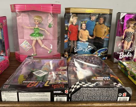 4 Collectible Barbie , Tinker Bell, Generational Girl, Barbie and Ken Star Trak, Nascar Official 94, in boxes, Location Right Wood Cart 4 Collectible Barbie , Tinker Bell, Generational Girl, Barbie and Ken Star Trak, Nascar Official 94, in boxes, Location Right Wood Cart