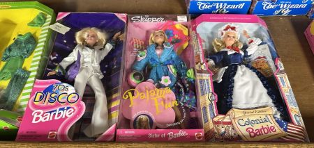 L3 Collectible Barbie, 70s Disco, Pajama, Colonial Barbie, in boxes, location Right Wood Cart L3 Collectible Barbie, 70s Disco, Pajama, Colonial Barbie, in boxes, location Right Wood Cart