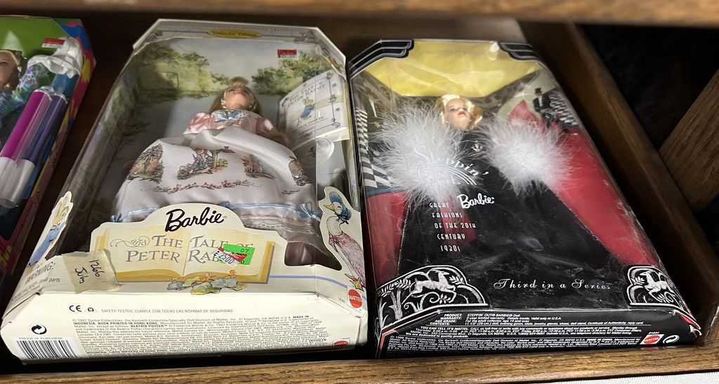 2 Collectible Barbie, The Tale of Peter Rabbit, 1920 Edition Barbie, in boxes, Location Right Wood Cart 2 Collectible Barbie, The Tale of Peter Rabbit, 1920 Edition Barbie, in boxes, Location Right Wood Cart