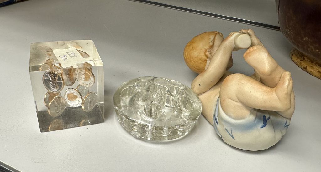 Cube of Pennies, Flower Glass Frog and Ceramic Figurine, Location Right Metal Shelves 39 Cube of Pennies, Flower Glass Frog and Ceramic Figurine, Location Right Metal Shelves 39