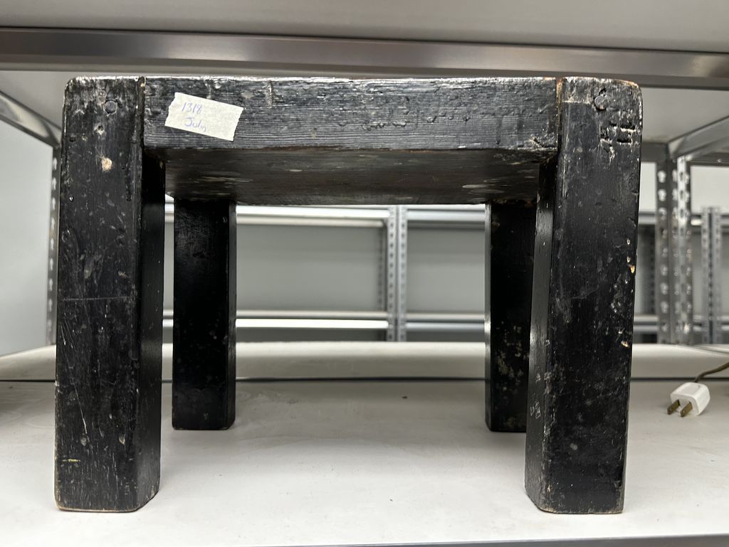 Hand Crafted Wood Stool, 9"h., 12"w. Location Right Metal Shelves 38 Hand Crafted Wood Stool, 9"h., 12"w. Location Right Metal Shelves 38