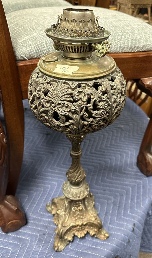 Vintage Ornate Metal Oil Lamp, 22"h, Location Left Office 2 Vintage Ornate Metal Oil Lamp, 22"h, Location Left Office 2