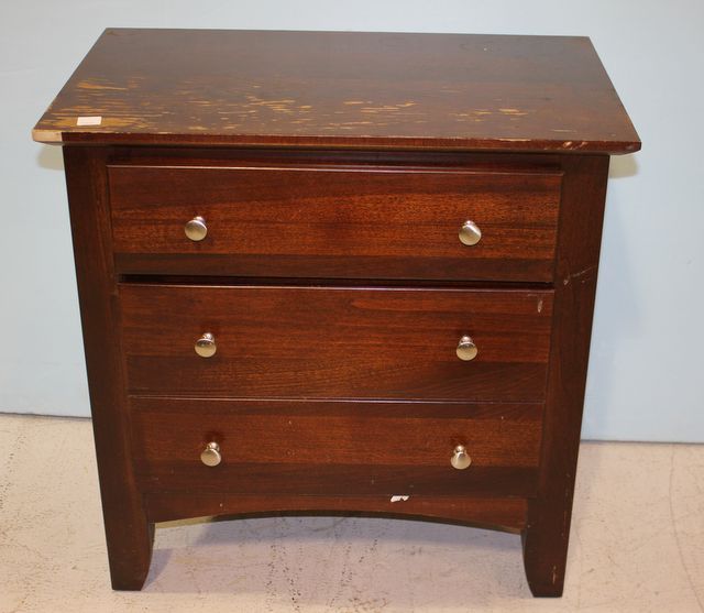 Contemporary Three Drawer End Table, cosmetic wear on top; 26" h., 26" w. Contemporary Three Drawer End Table, cosmetic wear on top; 26" h., 26" w.