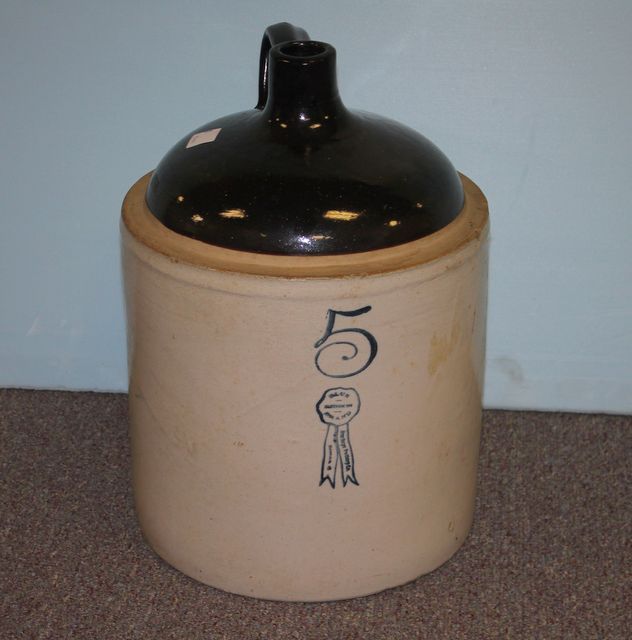 Antique Five Gallon Whiskey Jug, from manufacturer in Maryland; 12" dia., 17" h. Antique Five Gallon Whiskey Jug, from manufacturer in Maryland; 12" dia., 17" h.