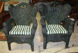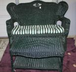 Painted Green Wicker Settee; 51" w., 25" d., 38 1/2"h., Two Wicker Arm Chairs, and a Green Wicker Coffee Table with Cushion and Pillows Painted Green Wicker Settee; 51" w., 25" d., 38 1/2"h., Two Wicker Arm Chairs, and a Green Wicker Coffee Table with Cushion and Pillows