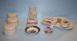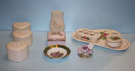 Group of Ten Various Porcelain Pieces, including a small dish with courtship scene 4 7/8" dia., vase (chips) 4 1/2" h., square dish 3 1/2" square, made in Romania Flower 2 1/2" dia., three porcelain hearts 3 7/8: dia., three piece set (tray, lipstick holder, covered dish) Group of Ten Various Porcelain Pieces, including a small dish with courtship scene 4 7/8" dia., vase (chips) 4 1/2" h., square dish 3 1/2" square, made in Romania Flower 2 1/2" dia., three porcelain hearts 3 7/8: dia., three piece set (tray, lipstick holder, covered dish)