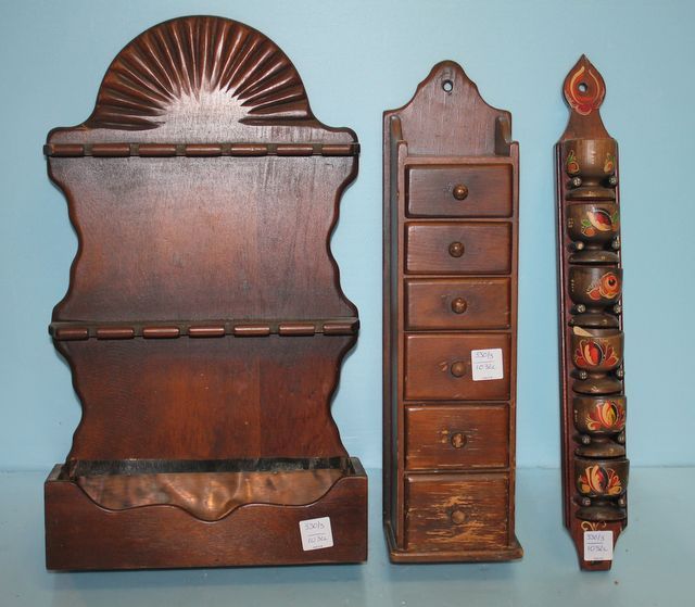 Three Wood Wall Pieces, Six Small Cups in Frame (some cracked or broken) 18" h., 2" w., Six Drawer Spice Cabinet 16 1/2" h., 4 1/2" w., Spoon Rack with Copper Lining 10" w., 18" h. Three Wood Wall Pieces, Six Small Cups in Frame (some cracked or broken) 18" h., 2" w., Six Drawer Spice Cabinet 16 1/2" h., 4 1/2" w., Spoon Rack with Copper Lining 10" w., 18" h.