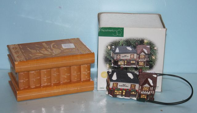 Two Decorative Items, "stack of books" box 6 1/4" w., 3 1/2" h., Department 56 "The Old Curiosity Shop" house 3 5/8" x 2 5/8" Two Decorative Items, "stack of books" box 6 1/4" w., 3 1/2" h., Department 56 "The Old Curiosity Shop" house 3 5/8" x 2 5/8"