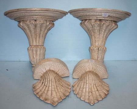 Group of Four Painted Wood Wall Sconces, crackled; one pair of shell shape 10" h., 7" w., one demi lune 12" w., 12" h. Group of Four Painted Wood Wall Sconces, crackled; one pair of shell shape 10" h., 7" w., one demi lune 12" w., 12" h.