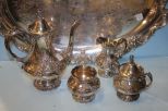 Five Piece "King Francis" Tea Service; 30" oval tray, waste, creamer, sugar, 12" h. teapot Five Piece "King Francis" Tea Service; 30" oval tray, waste, creamer, sugar, 12" h. teapot