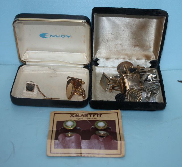 Six Pairs of Vintage Men's Cuff Links/Buttons, including gold and silver tone cuff links, one Envoy set in box, and a set of enameled buttons. Six Pairs of Vintage Men's Cuff Links/Buttons, including gold and silver tone cuff links, one Envoy set in box, and a set of enameled buttons.
