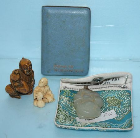 Two Netsukes, Jade Pendant and a Miniature Book; 2 ivory Netsukes, one jade pendant in gold setting and a miniature book entitles "Poems of Wordsworth" Two Netsukes, Jade Pendant and a Miniature Book; 2 ivory Netsukes, one jade pendant in gold setting and a miniature book entitles "Poems of Wordsworth"