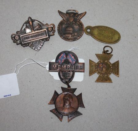 Group of Lapel Pins and Charms; one Memphis SCV June 1902 Lapel pin with NB Forrest, one 1928 VP lapel pin, one UDC pendant to the SCV, one Dinkler Hotel charm, one Democratic National charm Group of Lapel Pins and Charms; one Memphis SCV June 1902 Lapel pin with NB Forrest, one 1928 VP lapel pin, one UDC pendant to the SCV, one Dinkler Hotel charm, one Democratic National charm