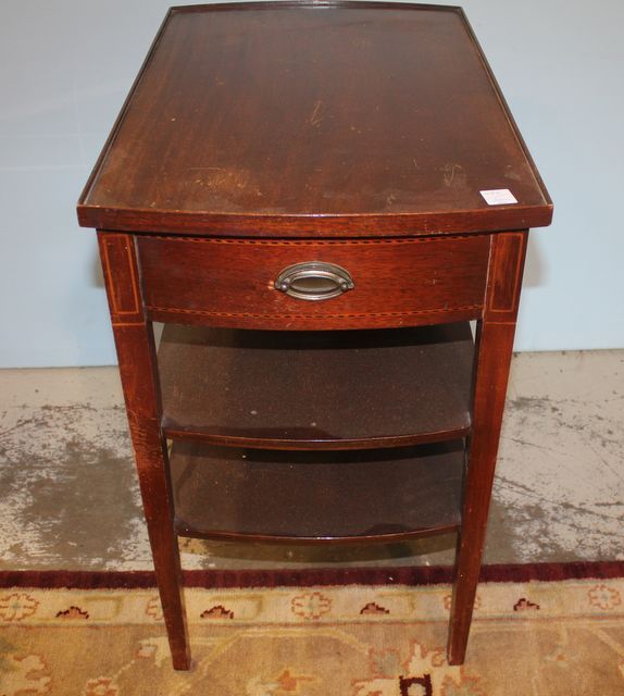 Mahogany String Inlaid Table with Two Shelves; one drawer; 25" l., 15" w., 25" h. Mahogany String Inlaid Table with Two Shelves; one drawer; 25" l., 15" w., 25" h.