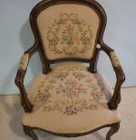 Walnut French Arm Chair with Needlepoint Flower Tapestry; 35" h. Walnut French Arm Chair with Needlepoint Flower Tapestry; 35" h.