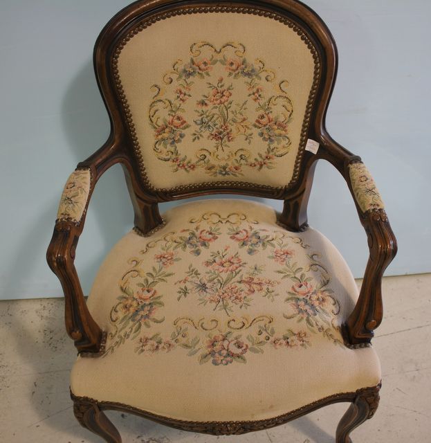 486 Walnut French Arm Chair with Needlepoint Flower Tapestry